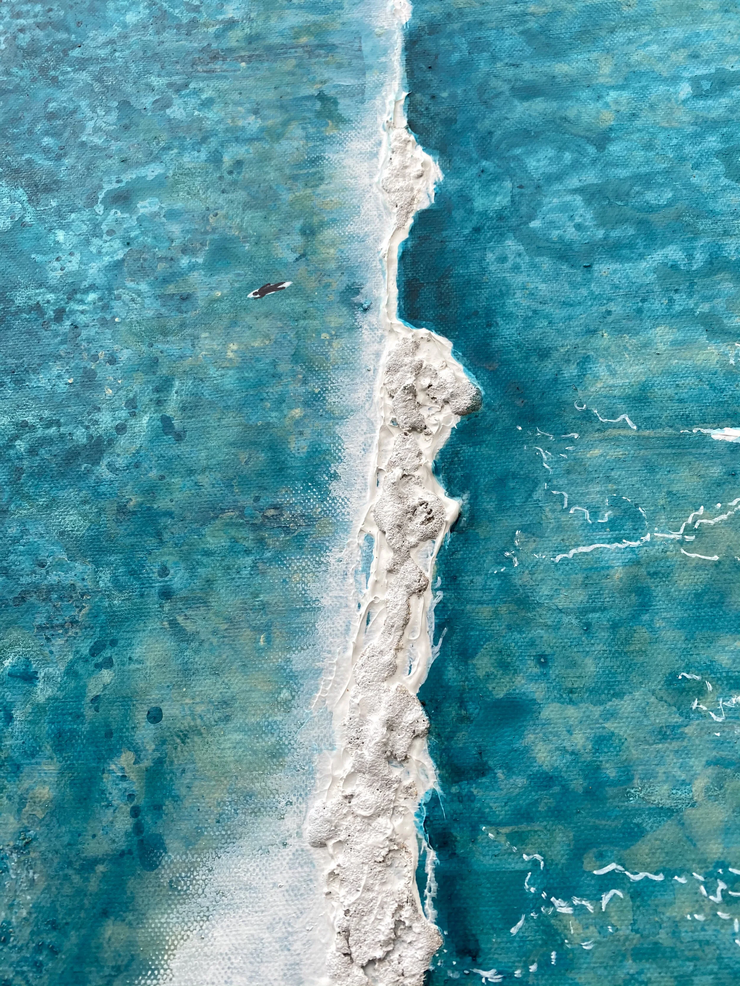 I sat for what felt like hours watching the waves roll in this day, studying the surfers in the line up, paddling out to the back, patiently waiting their turn to catch a wave. I wanting to capture this feeling of patience, of waiting for what was about to come in this piece.
