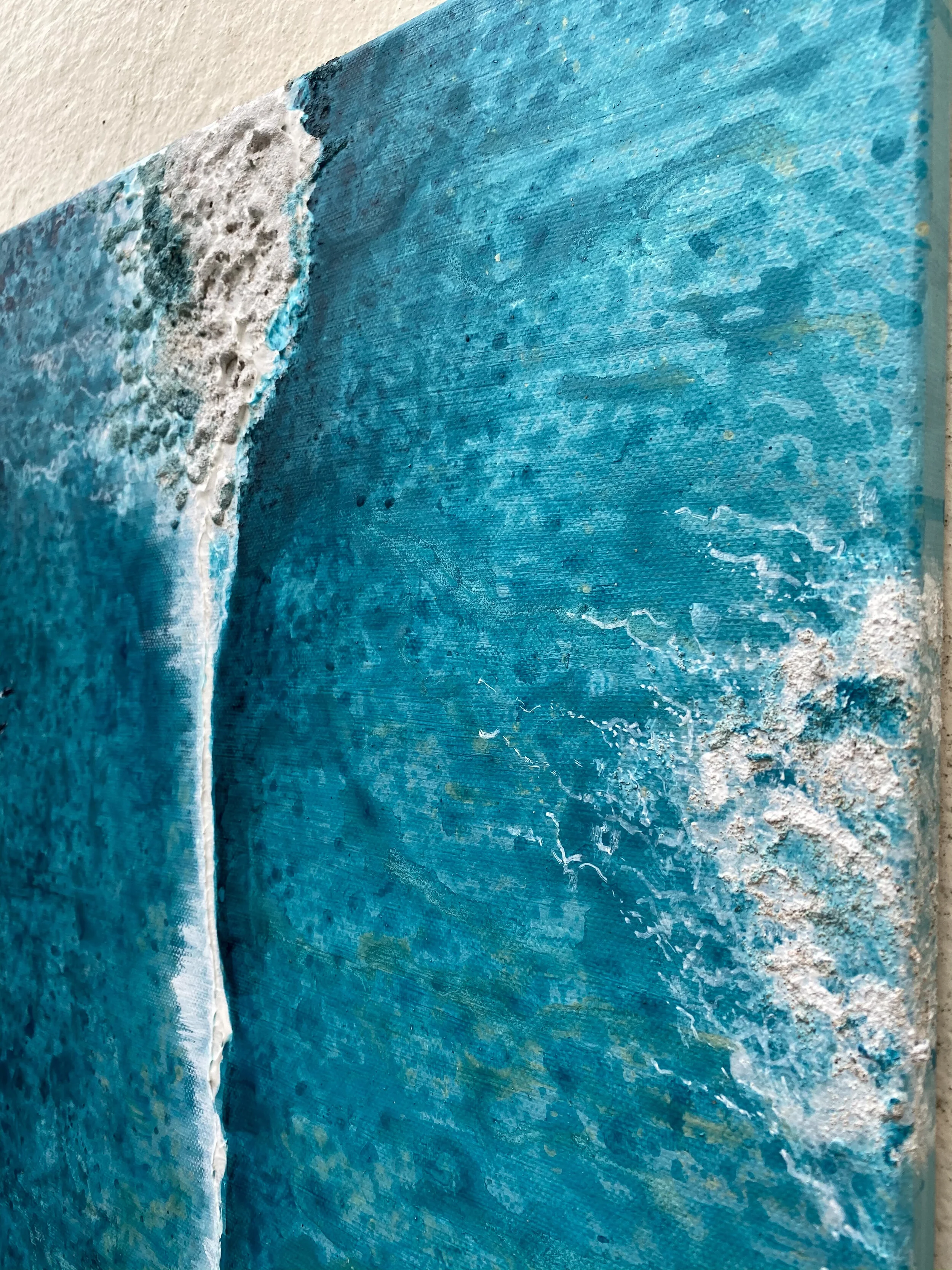 I have used sea salt and sand in the acrylic paint to build the depth in the breaking wave and fine poska pen to add the fine detail in the white water.