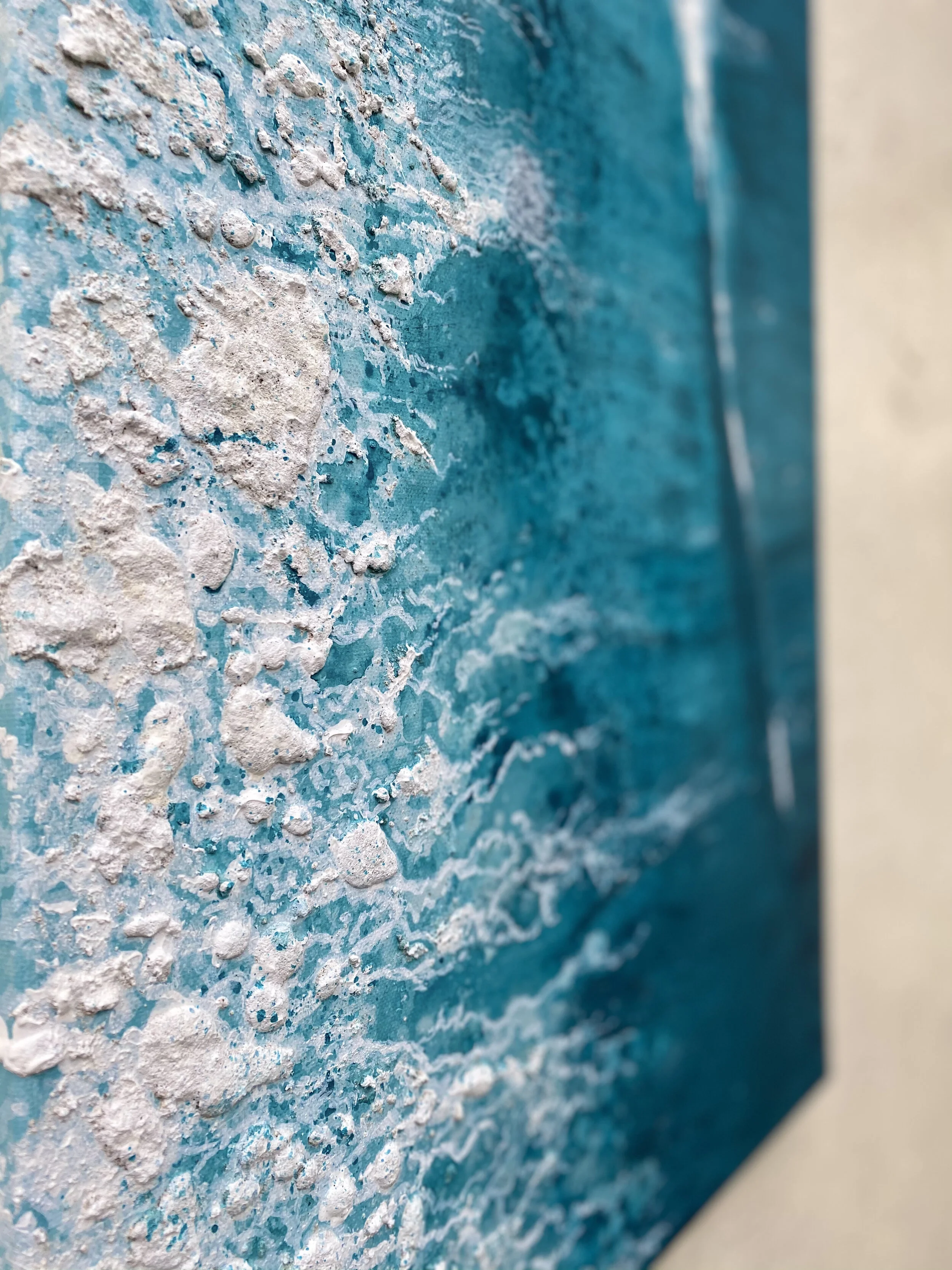 I have used sea salt and sand in the acrylic paint to build the depth in the breaking wave and fine poska pen to add the fine detail in the white water.