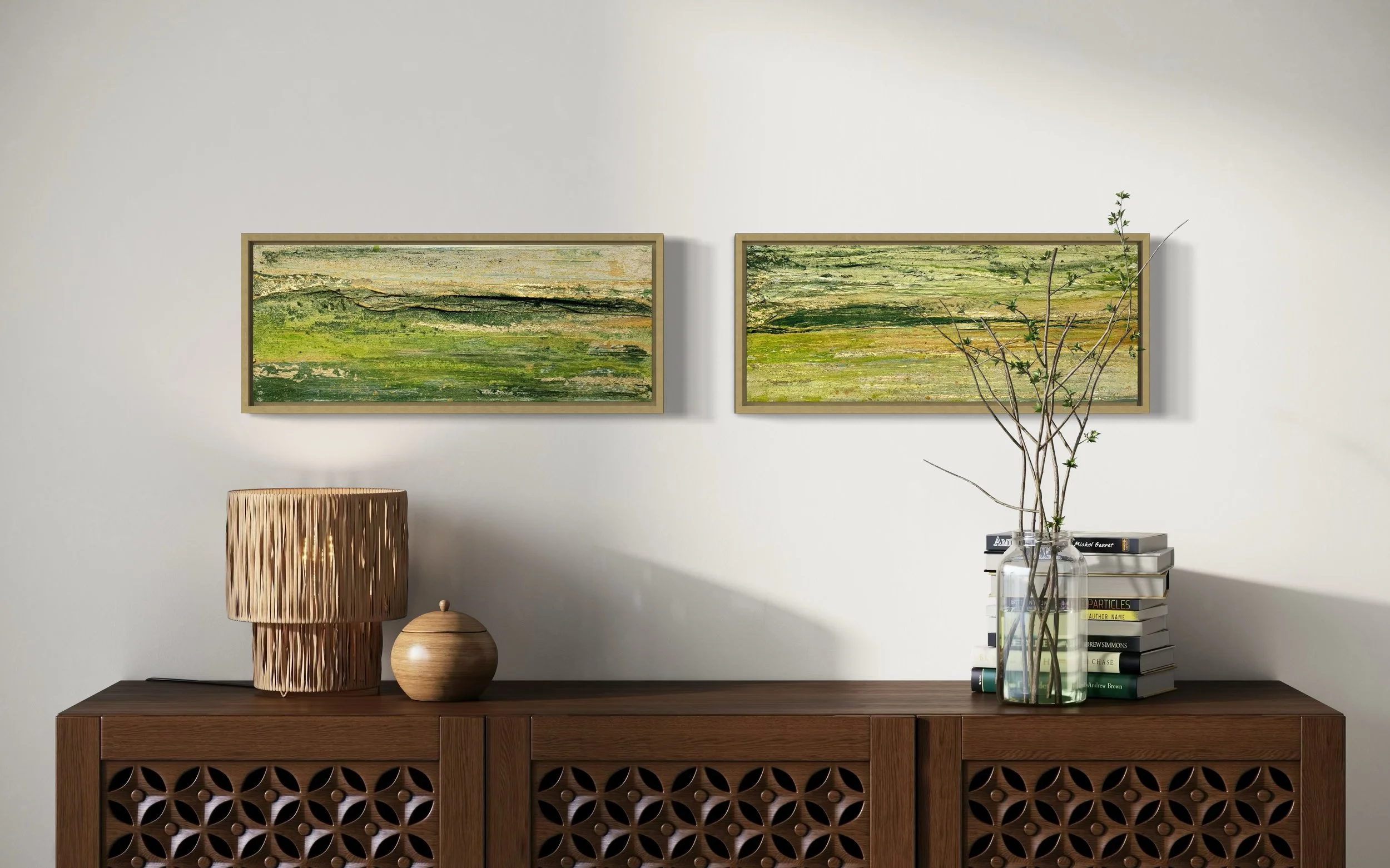This piece, painted as a duo but can be bought as a stand alone piece, is a further study of the root systems and textures beneath the feet whilst walking through the moors. From bark, to moss, to flowing water to silt.
