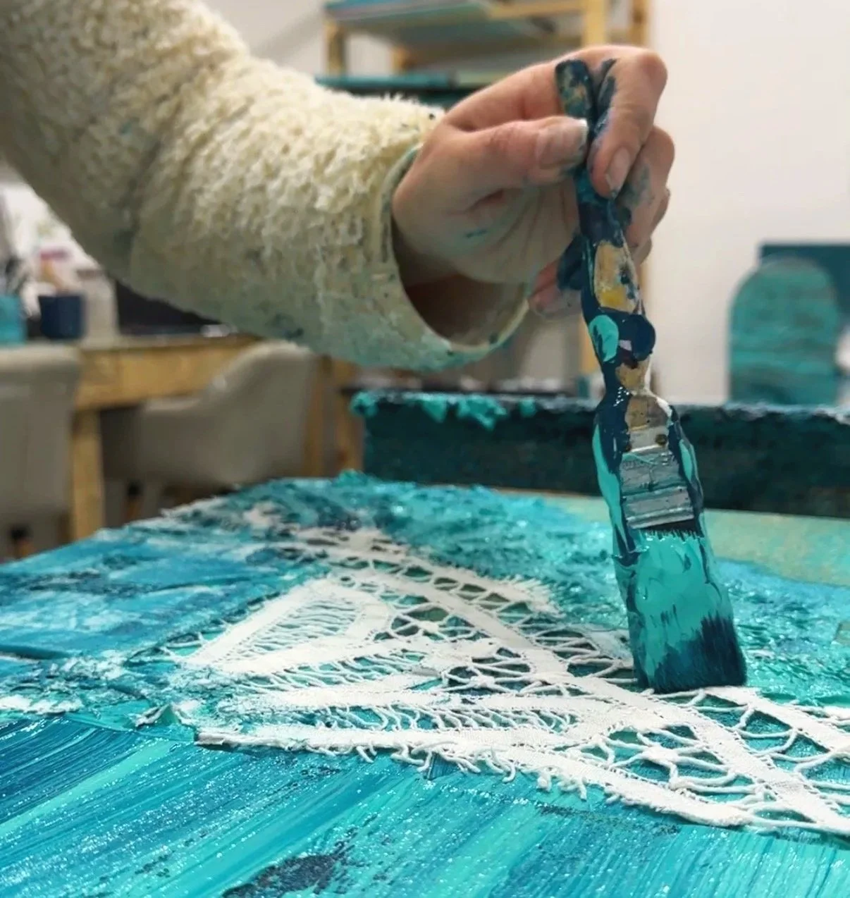 Collectors often tell me they feel a sense of calm when they stand in front of the work. I think that calm comes from more than colour. It comes from depth. From material. From the subtle story held in the surface.