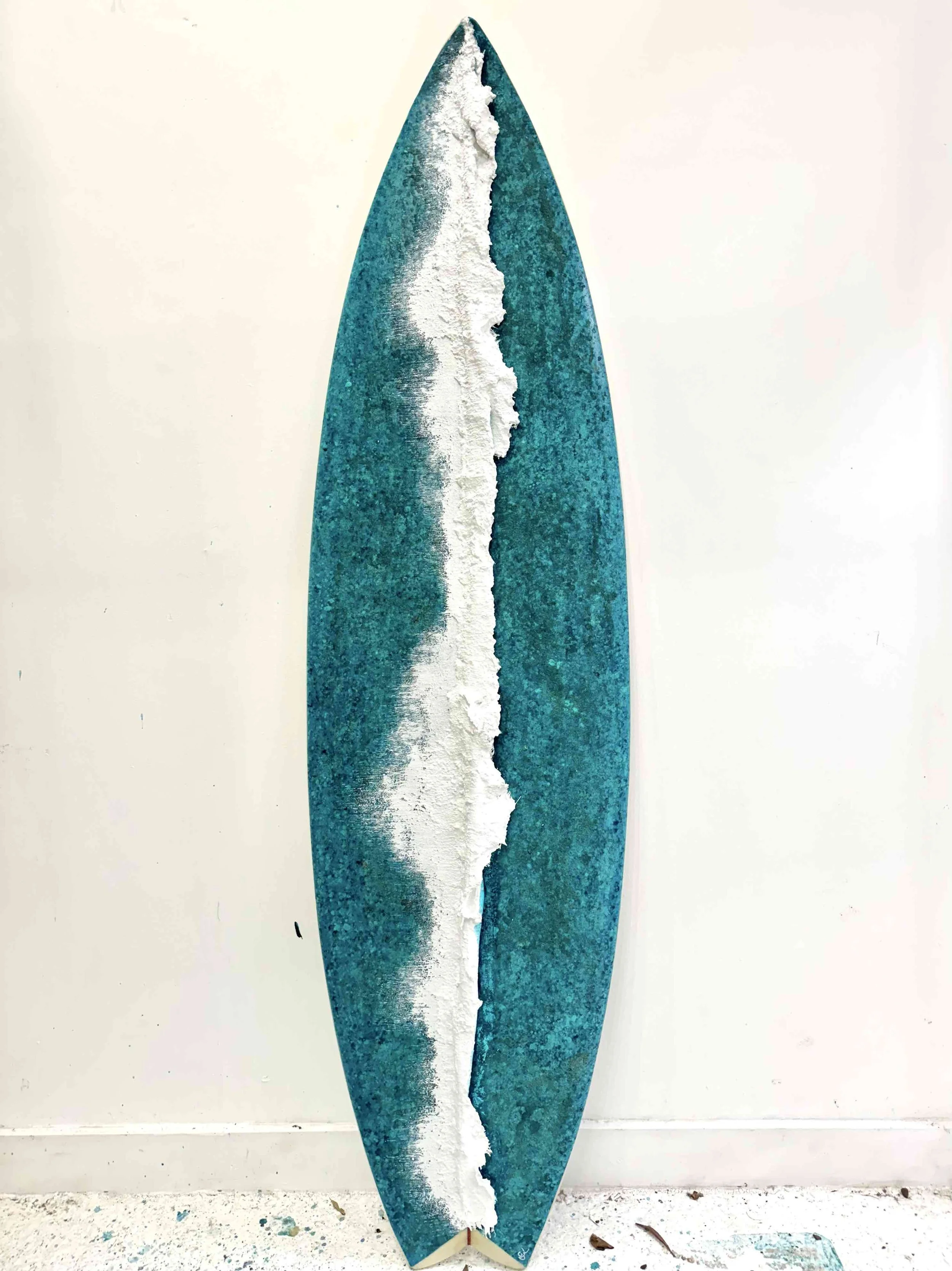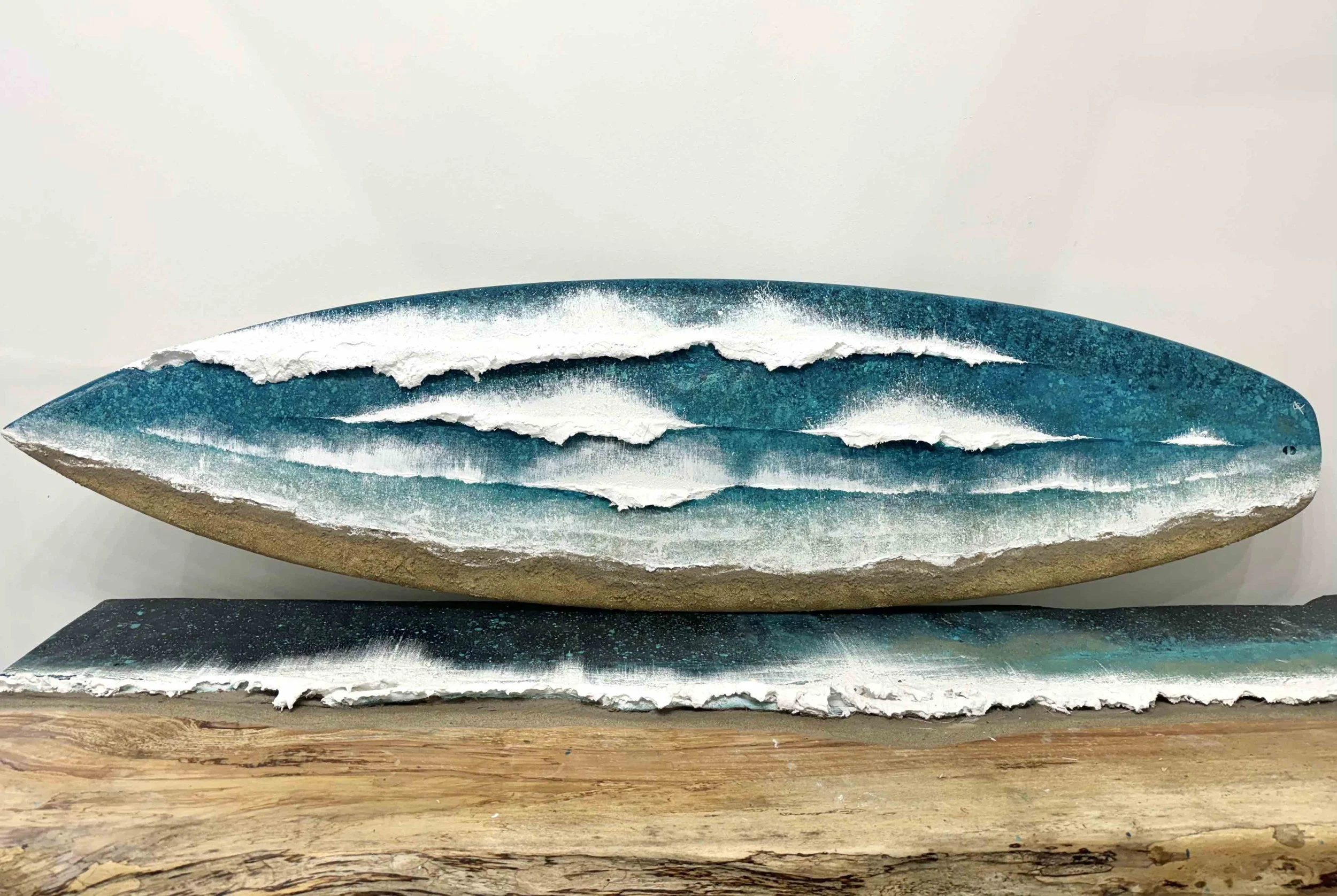 My love for surfboards isn’t just artistic; it’s personal. I spent a decade working as a fashion buyer for the surf industry, immersing myself in the surf world — attending competitions, designing surf clothing, traveling with surfers, and being part of the culture. Through all those years, I saw the deep connection surfers have with their boards. Every trip, every wave, every dent or ding — those are all part of the board’s history. When I paint on a surfboard, I’m honouring that history, telling a story that’s both personal and universal.