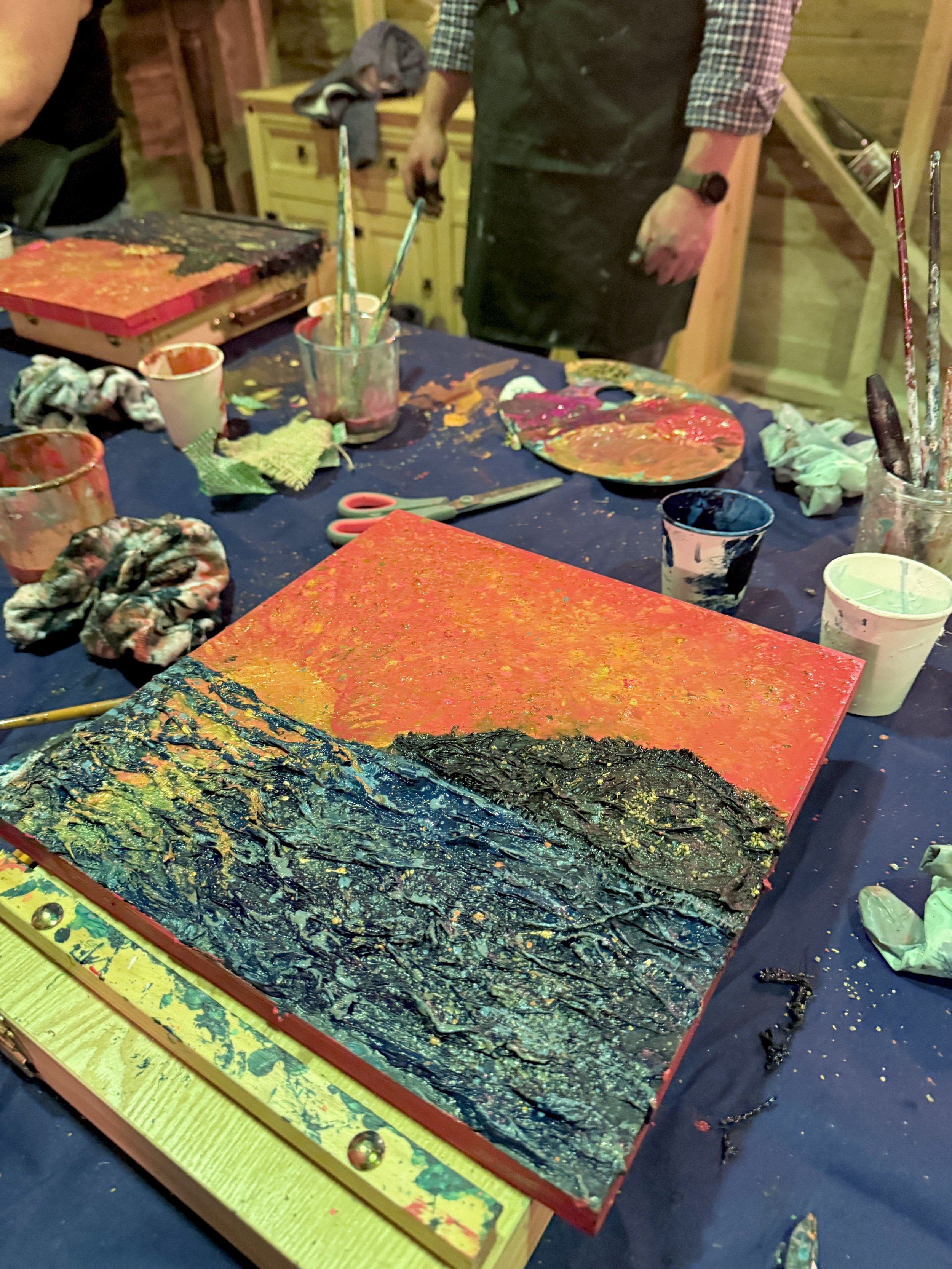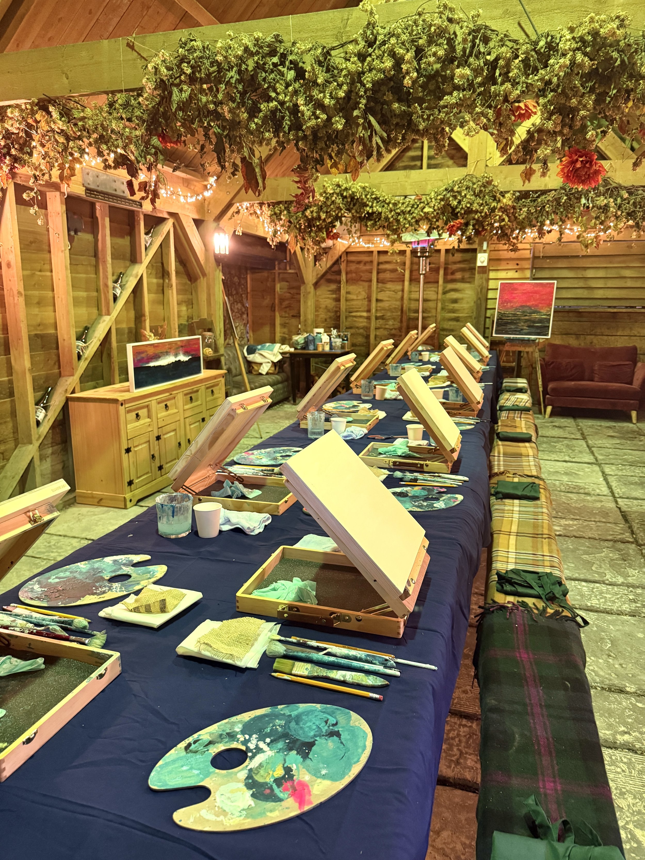 Set beneath the beams of their stunning rustic barn, this exclusive workshop invites you to unwind and explore your creativity as we paint the mesmerising sunset hues of the ocean — those dreamy, golden tones that shimmer across the water as the day fades.